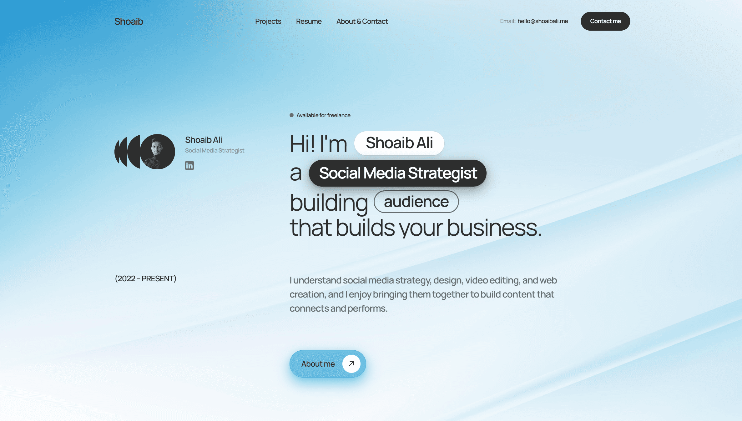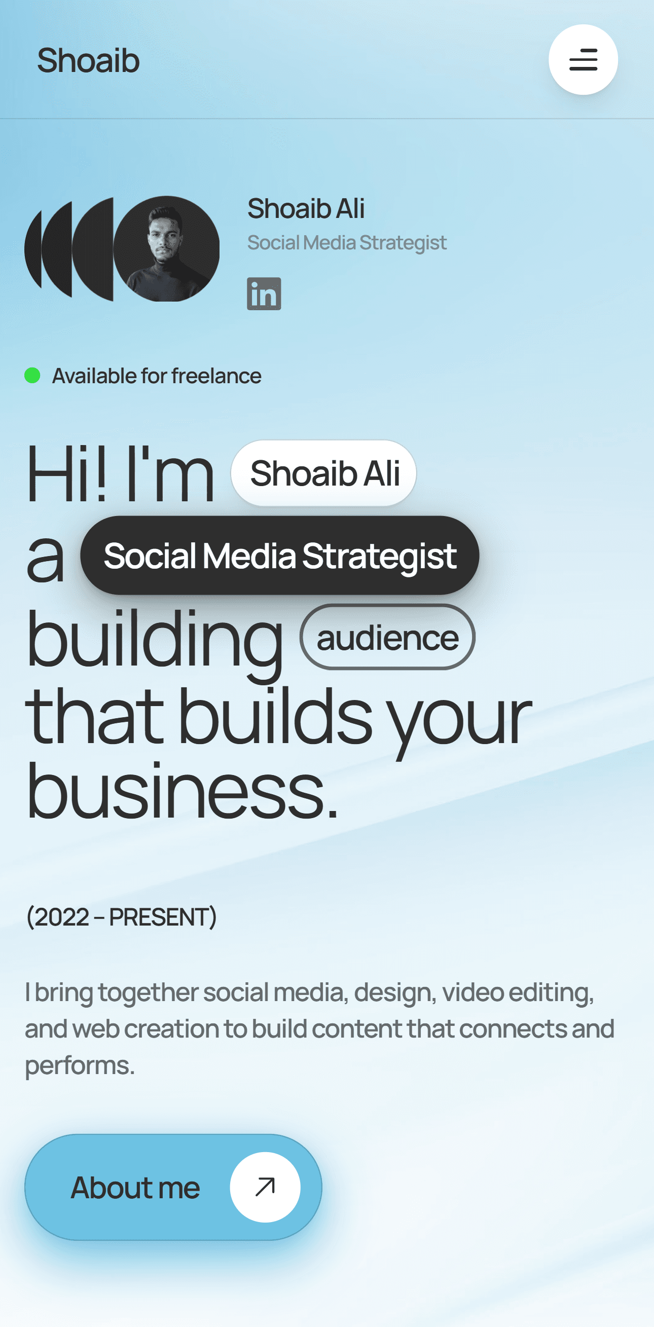 A structured multi-discipline portfolio built on Framer, customized to reflect personal branding and present work across social media growth, web design, graphics, and video.